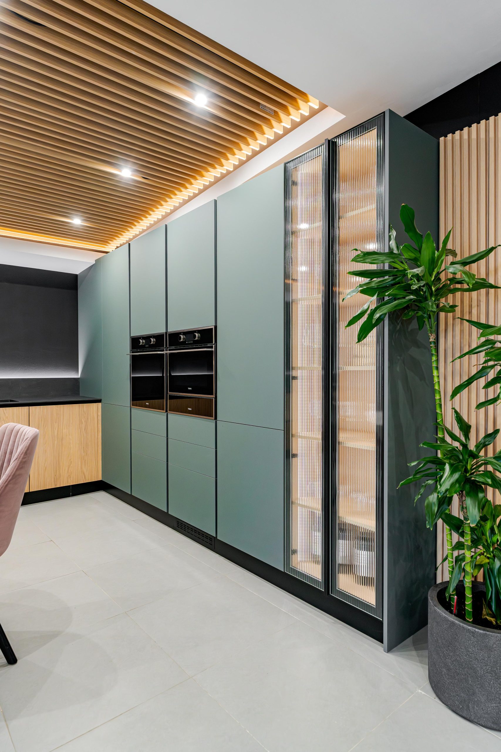 - Integrare totală (Panel-ready): Tendința actuală este de a masca tehnologia complet. De la frigidere și mașini de spălat vase, până la cuptoarele cu microunde, totul este ascuns în spatele fronturilor de mobilier. Tehnologia este acolo, își face treaba, dar nu mai dictează estetica încăperii.