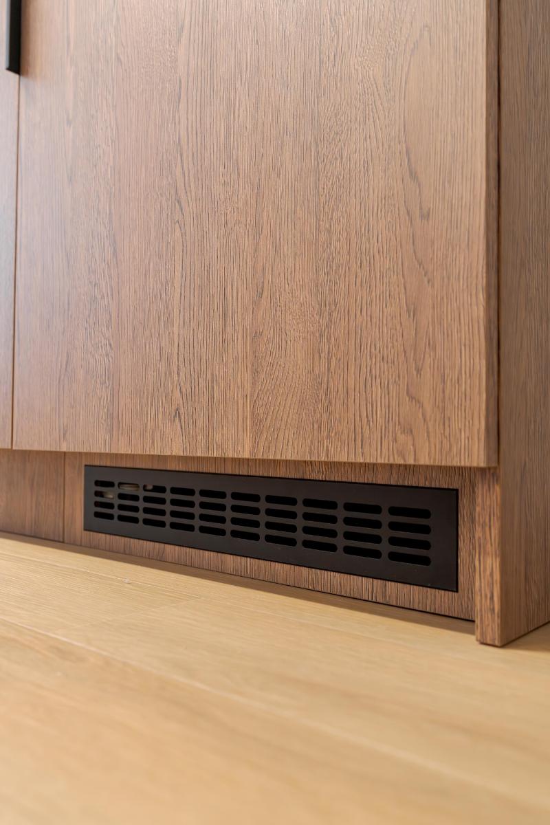Organizarea bucătăriei este gândită pentru un flux coerent și eficient: corpuri înalte care integrează electrocasnicele și centrala, astfel încât totul să rămână uniform și estetic.