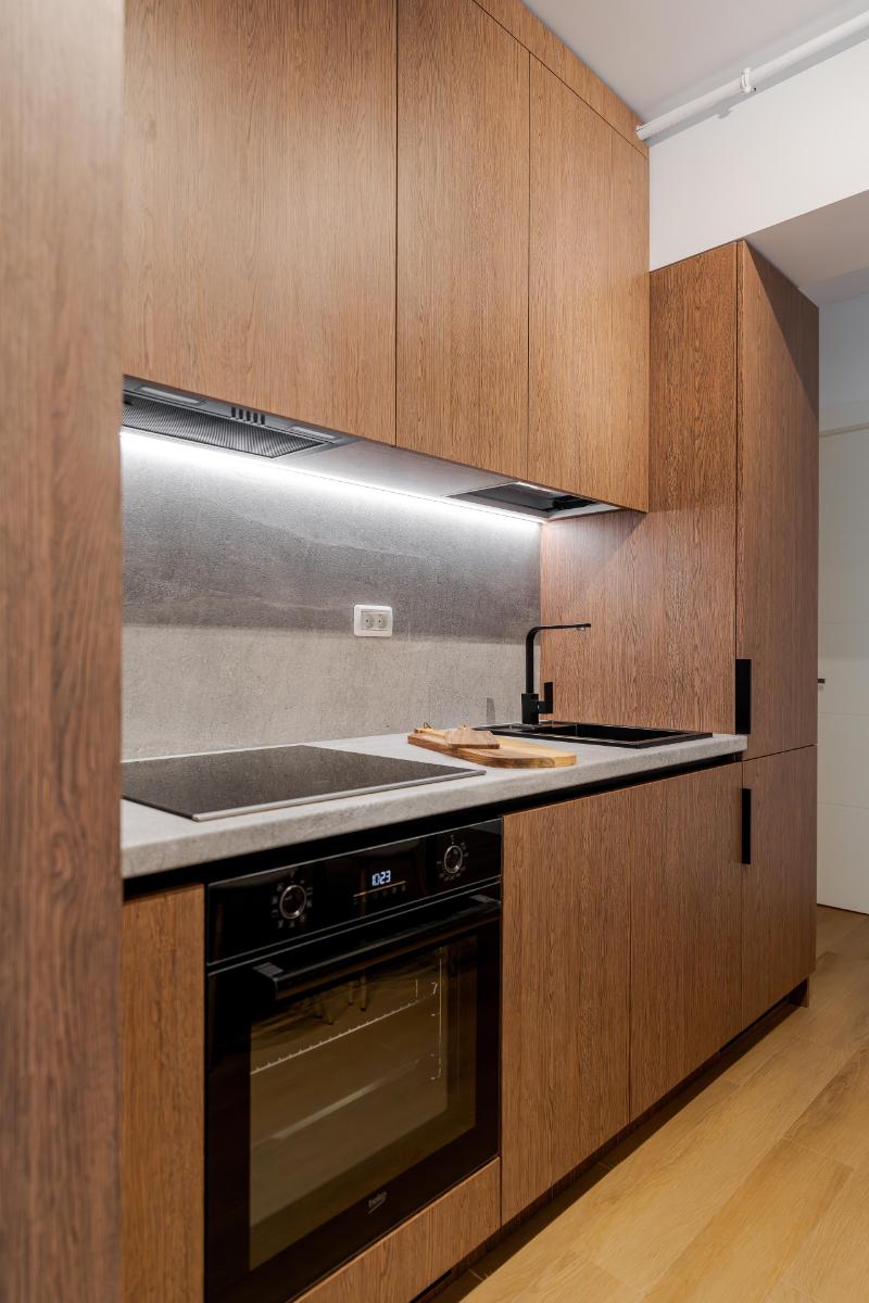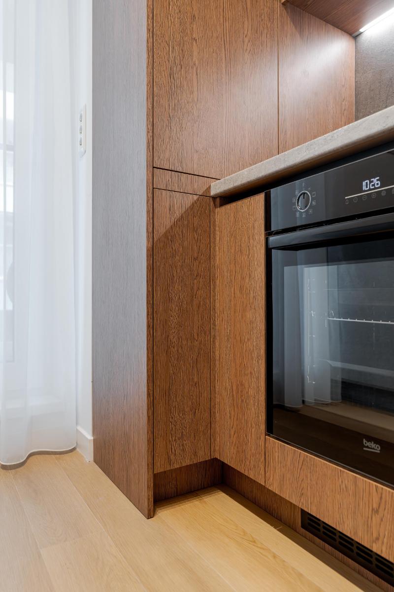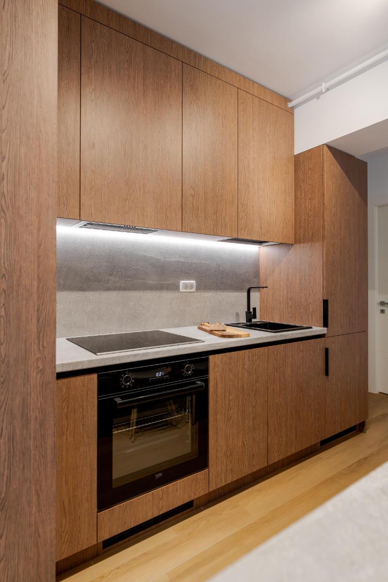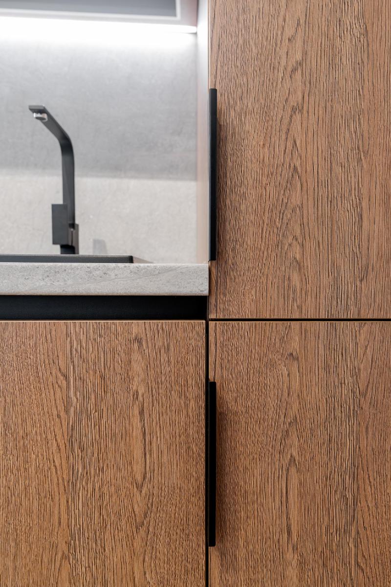 Fronturile și elementele vizibile sunt realizate în două finisaje complementare: unul cu textură de stejar și celălalt cu aspect mineral, o combinație care aduce căldură și eleganță în același timp.