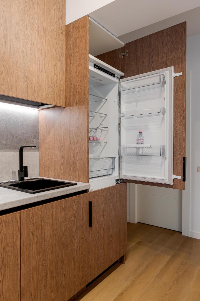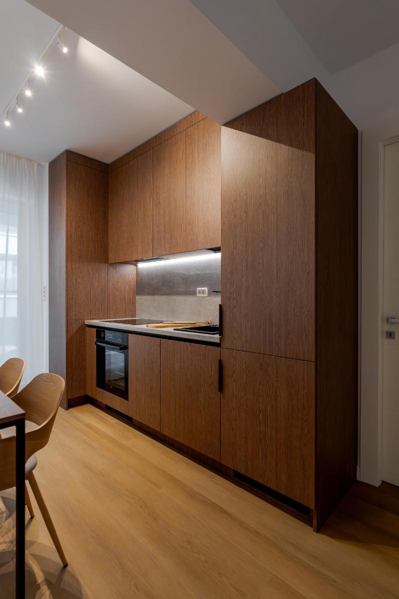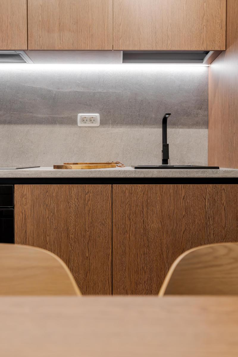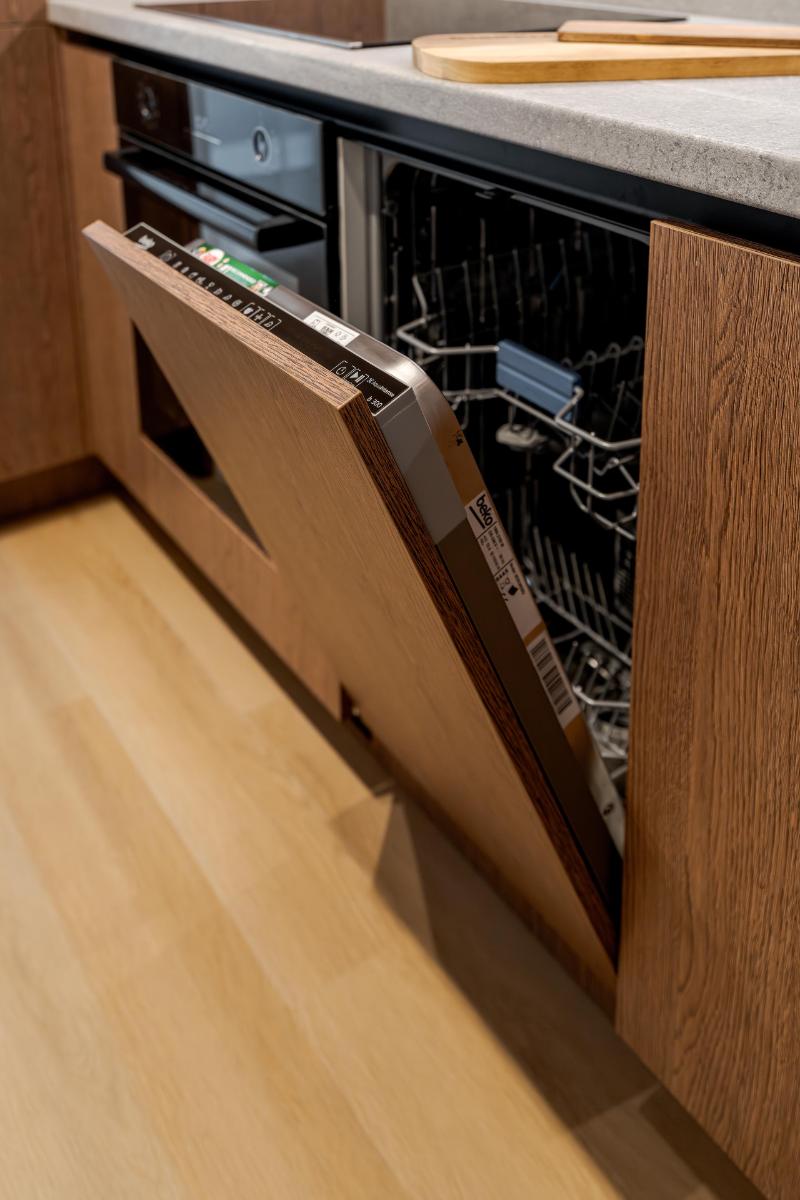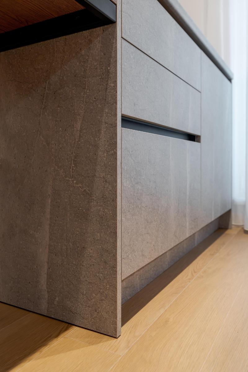 Fronturile și elementele vizibile sunt realizate în două finisaje complementare: unul cu textură de stejar și celălalt cu aspect mineral, o combinație care aduce căldură și eleganță în același timp.