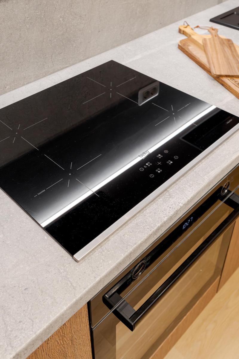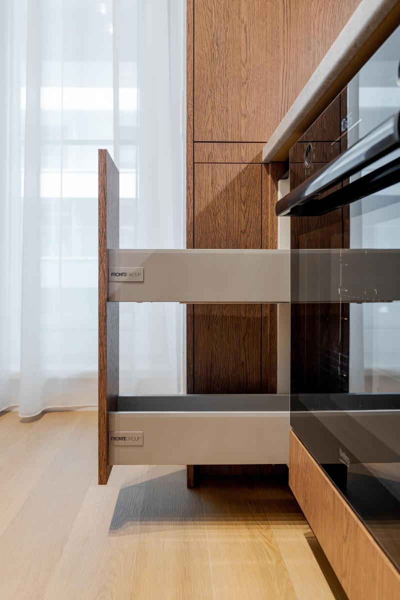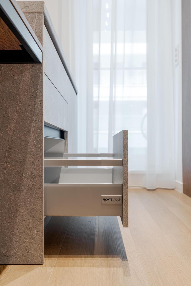 Spațiile de depozitare sunt optimizate prin sertare Tandembox Antaro și accesorii moderne, precum coșul Jolly sau scurgătorul de vase de 600 mm. Fronturile suspendate sunt coborâte cu 15 mm sub placare, pentru o deschidere ușoară și un aspect minimalist.