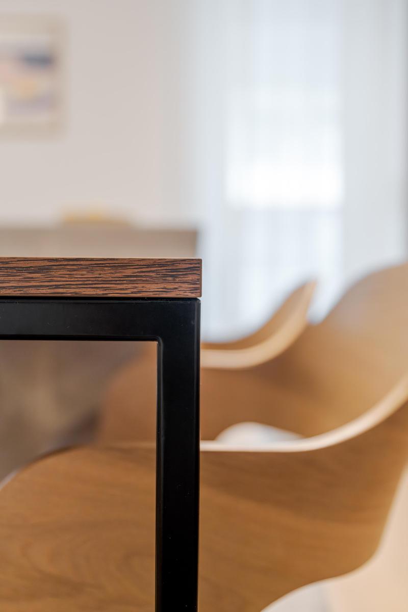 Blatul termorezistent de 38 mm păstrează aceeași linie vizuală, iar panoul spate Egger adaugă coerență designului. Masa din continuarea insulei are cadru metalic din țeavă rectangulară, vopsit negru mat RAL 9005, detaliu care aduce o notă industrială subtilă.