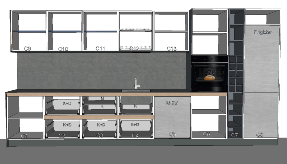 - Prețul prezentat nu include blat, contrablat, chiuveta si nici electrocasnicele din imagini (plită, cuptor, hotă, masina spalat vase, frigider incorporat, etc). Acestea sunt prezentate doar în scop demonstrativ.