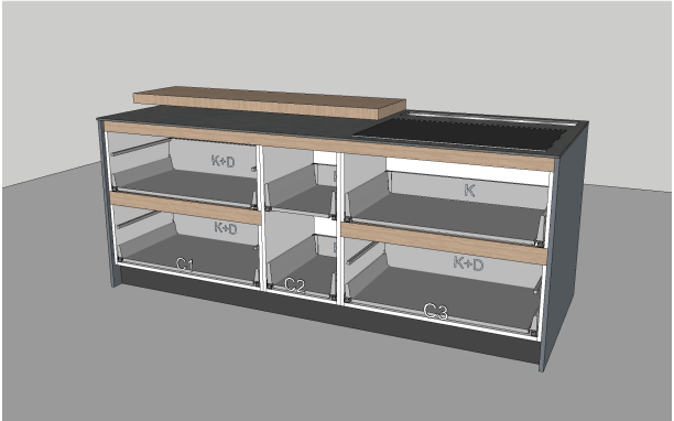 Transformă-ți bucătăria cu această insulă modernă, din materiale premium: fronturi MDF gri antracit, accente din furnir de stejar, blat HPL compact și zonă volumetrică din stejar. Sertarele și coșurile Tandembox Antaro, iluminarea LED cu senzori și picioarele reglabile Axilo îți oferă confort și funcționalitate maximă.