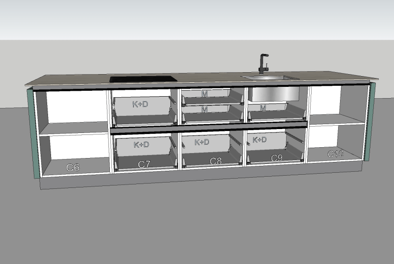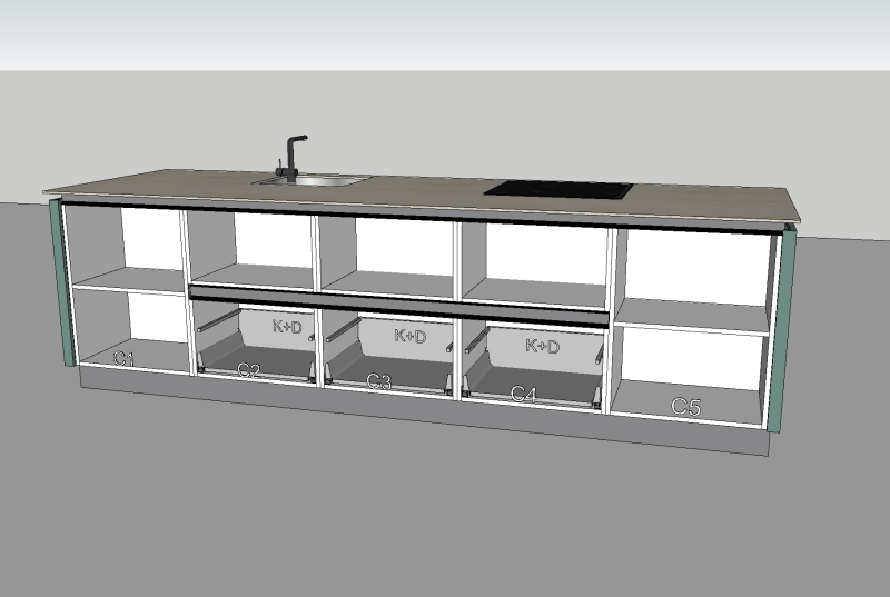 - Fronturi coloane, laterale vizibile, corp deschis cu polite: MDF Vopsit 1 fata NCS S 6010 B90G (verde nordic) mat, 18mm;
