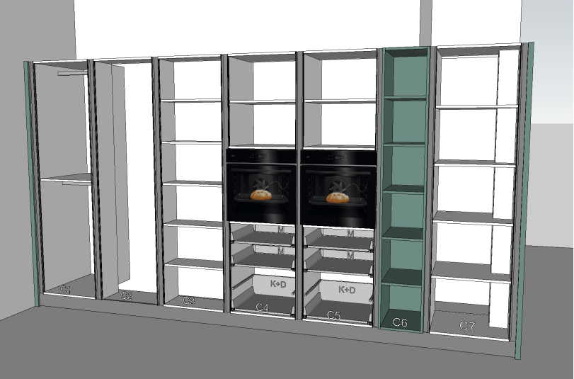 - Fronturi coloane, laterale vizibile, corp deschis cu polite: MDF Vopsit 1 fata NCS S 6010 B90G (verde nordic) mat, 18mm;
