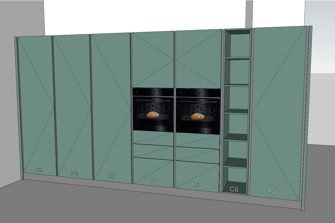 - Fronturi coloane, laterale vizibile, corp deschis cu polite: MDF Vopsit 1 fata NCS S 6010 B90G (verde nordic) mat, 18mm;