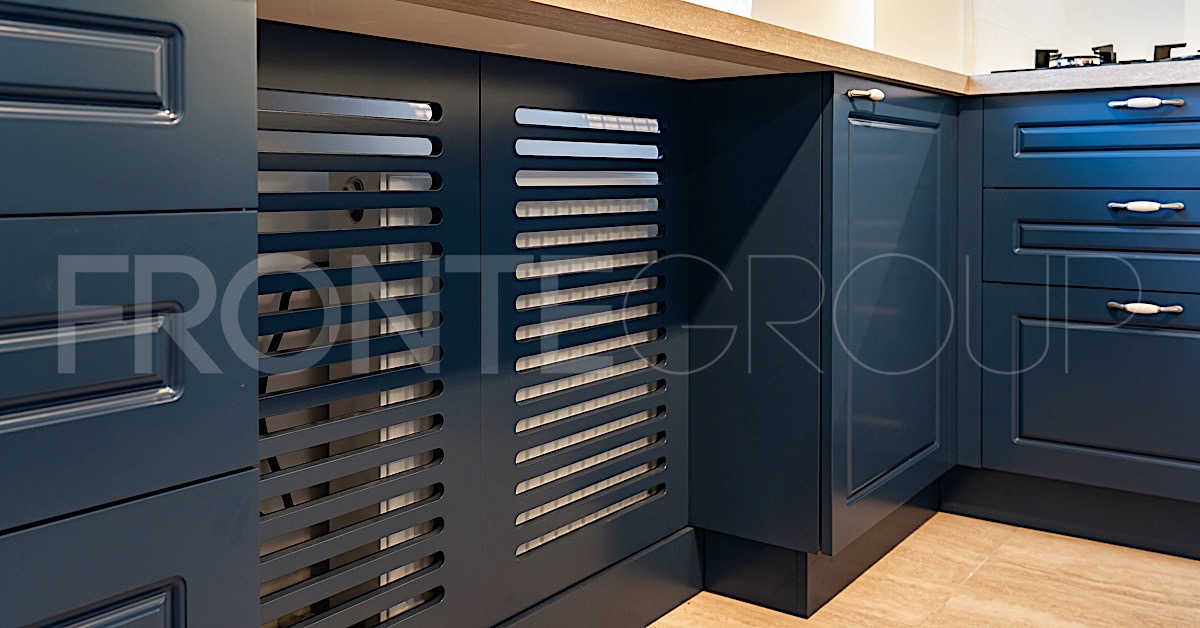 În afară de linia cromatică, stilul clasic al acestei bucătării este dat de fronturile cu frezări ornamentale, fronturile cu cercevele, mânerele elegante si colțul cu rafturi deschise.