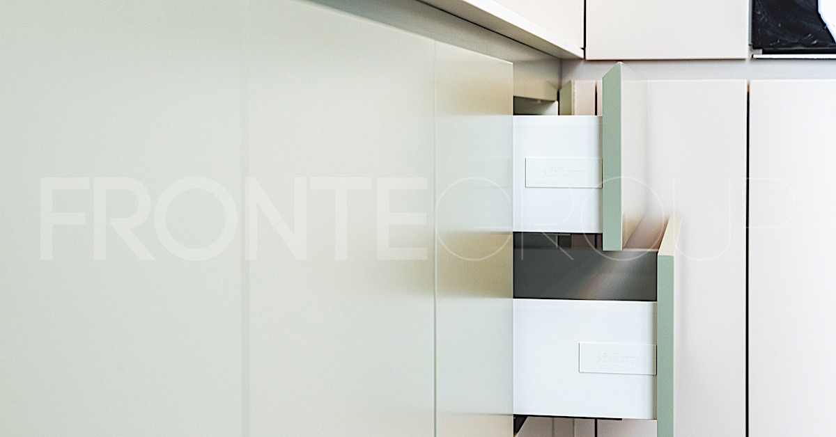 Designul este modern, simplu, minimalist, cu fronturi fără ornamentații și fără mânere aplicate. Albul și lemnul alternează cu sclipirile gri și negre ale tehnologiei moderne. Zona de lucru este foarte aerisită, iar pentru a nu încărca toți pereții bucătăriei, în zona de deasupra blatului există un singur corp de mobilier, cu geam.