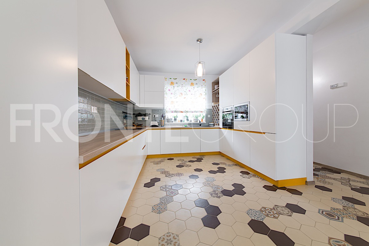 Unul dintre cele mai importante elemente ale acestei bucătării moderne cu depozitare eficientă este designul minimalist și elegant. Fronturile mobilierului sunt simple, fără frezări sau mânere aplicate, iar albul mat domină întreaga încăpere. Totuși, pentru a adăuga dinamică și lumină, au fost integrate accente de galben, care revitalizează întreaga atmosferă a bucătăriei. Această combinație de culori creează un contrast plăcut și un ambient luminos, perfect pentru un spațiu de gătit și socializare.