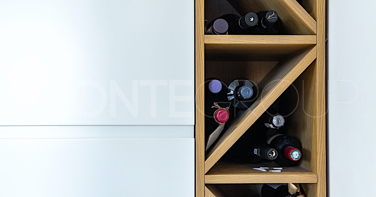 Iluminarea LED cu senzor touch este integrată în placarea suspendatelor. Lumina caldă oferă vizibilitate în zona de lucru și completează atmosfera relaxantă a bucătăriei. Rafturile deschise laterale adaugă spațiu pentru sticle de vin, cărți sau decorațiuni.
