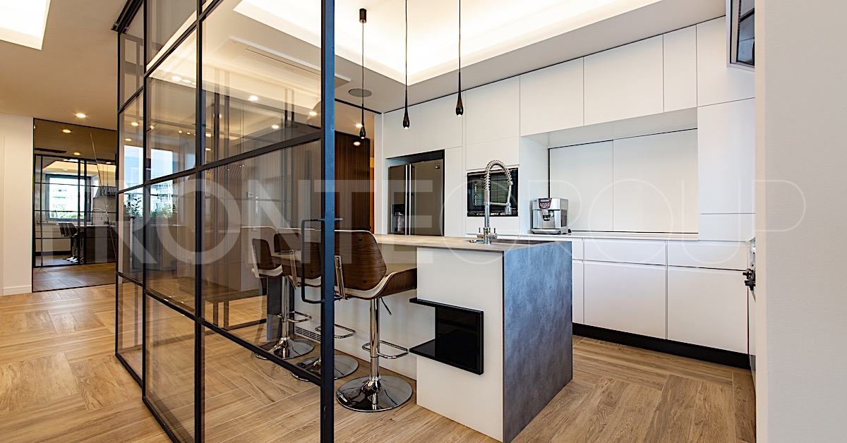 Bucătăria Moonstone face parte dintr-un proiect complet de amenajare, care a presupus realizarea de mobilier personalizat, mobilier la comandă, pentru întreaga casă. În afară de bucătărie, am realizat mobilă custom pentru zona de living, unde rafturile de bibliotecă se potrivesc perfect cu zona șemineului. De o provocare interesantă am avut parte în realizarea unui corp de mobilier ce se află în prelungirea bucătăriei, ce are scopul de a depozita vesela și pahare, dar în care a fost montat și un acvariu. Un astfel de corp de mobilă nu putea fi făcut decât 100% personalizat.
